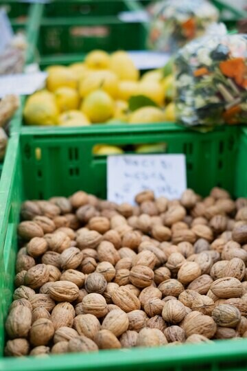 - (…) o mercado das nozes em casca onde Portugal importa cerca de 95% do que consome é bastante original. O seu consumo restringe-se essencialmente ao último trimestre do ano, descendo drasticamente até à Páscoa e a partir daí é quase nulo. As nozes importadas têm origem no Chile, França e Estado Unidos da América. A produção mundial é de aproximadamente 1 200 000 t e a China é o maior produtor. Admitindo que as nozes que aparecem no mercado são frescas - o que nem sempre acontece… - e considerando que o prazo de consumo de nozes naturais não deve ir além dos 11 meses e nozes lexiviadas (branqueadas) menos 2 ou 3 meses, a produção nacional pode ter algum interesse, principalmente para as nozes produzidas no Baixo Alentejo em que há variedades cuja apanha começa entre 10 e 15 do mês de Setembro e passados 4 dias estão disponíveis.”