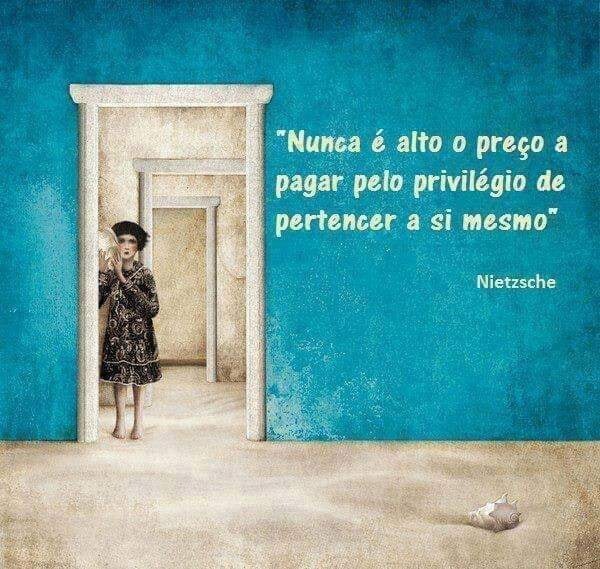 Podia ser um de nós aquela figura a espreitar através de portas sucessivas, como se cada uma representasse um novo limiar de consciência ou de liberdade pessoal. O fundo azul evocará a tranquilidade de quem procura a verdade dentro de si, enquanto as portas abertas poderão sugerir possibilidades infinitas de crescimento. Aquela frase inscrita, de Nietzsche – “Nunca é alto o preço a pagar pelo privilégio de pertencer a si mesmo” – reforça a importância de sermos fiéis à nossa essência, ainda que tamanha demanda exija esforço e sacrifício.