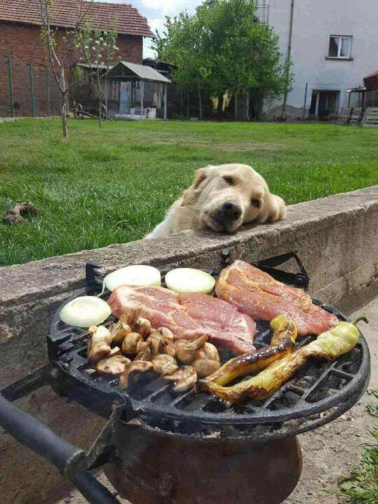 Veja-se este mártir de quatro patas: olhar perdido, alma vazia, nariz a aspirar os aromas proibidos de uma grelha onde a carne chia, os cogumelos imploram e a cebola carameliza. É a tragédia universal: querer e não poder.