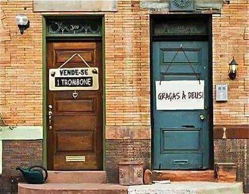 Eis a genialidade urbana: de um lado, um trombone implora por novo dono; do outro, alguém agradece a Deus com convicção quase litúrgica. Cá entre nós, partilho o sonho de tanta gente, que enfrenta trombones (e outros ruídos) como penitência diária.