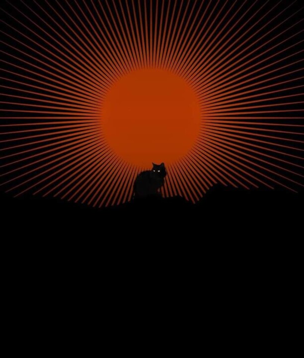 O gato, na imagem, observa e se faz cúmplice do silêncio, emoldurado pelo sol - símbolo da consciência plena, ardente e solitária - onde a liberdade dialoga com a tristeza, e o sentido da existência repousa na aceitação do vazio.
